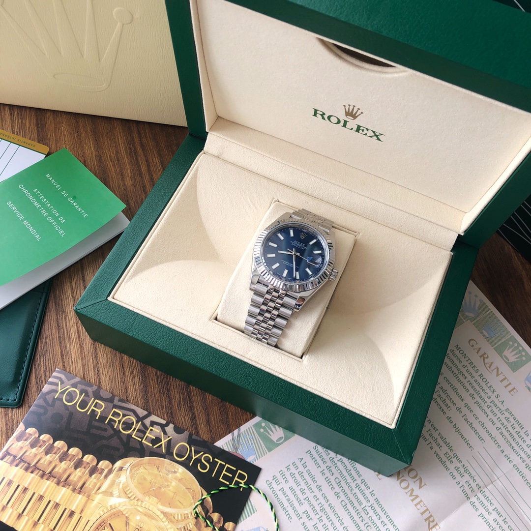 This Oyster Perpetual Datejust 41 in Oystersteel and white gold features a bright blue dial and an Oyster bracelet.
