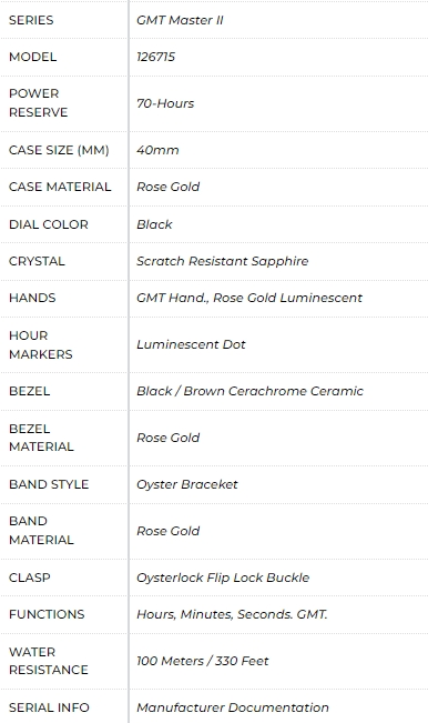 DetailProduct Information:Condition: New 2024. Includes Box, Card, Warranty Booklet.Resistance: 100m/330ftBracelet: 18k Rose Gold OysterlockMovement: 31 Jewel Chronometer MovementCase: 18k Rose GoldBezel: Ceramic (Rootbeer)Crystal: Sapphire CrystalDial: BlackSize: 40mmBox, Card & Papers Included
